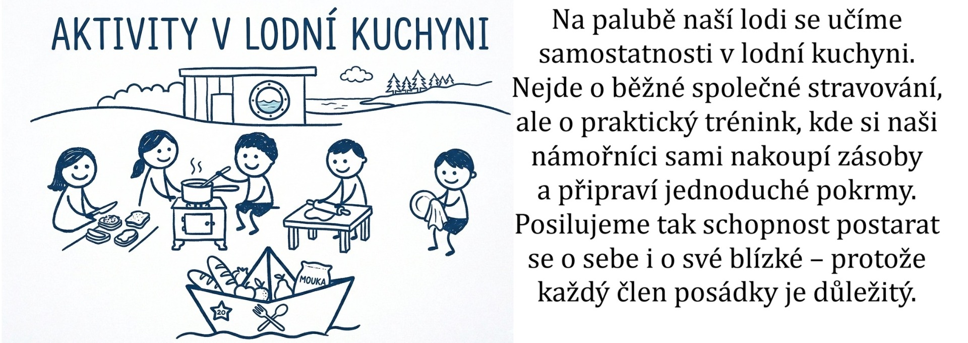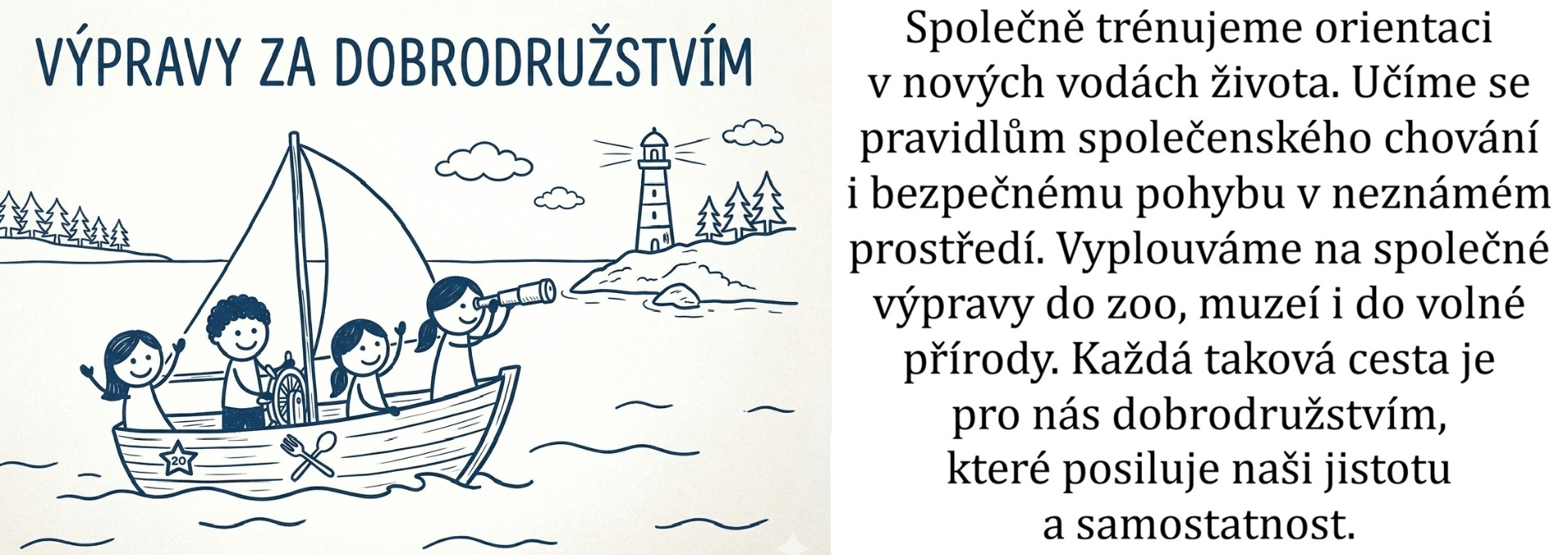 Náš spolek se zaměřuje na učení prožitkem. Posádka se u nás učí vzájemně se podporovat a skrze společné zážitky přirozeně zvládat situace každodenního života. Budujeme tak jejich sebedůvěru a samostatnost v reálném světě.